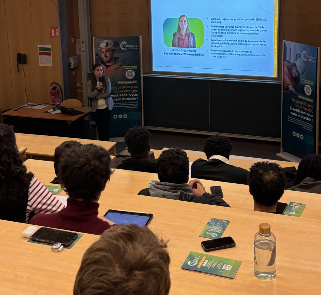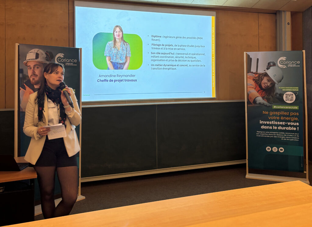 Amandine, cheffe de projet travaux, a illustré les perspectives d’évolution chez Coriance et la richesse des missions confiées aux ingénieurs.